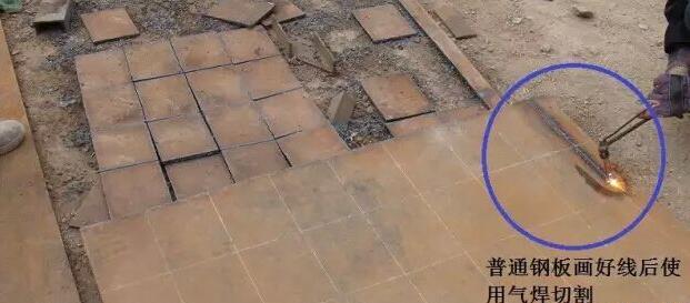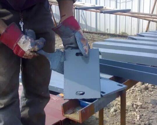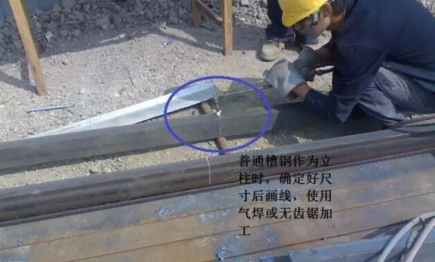 2、對槽鋼進行加工時,首先校直,去除表面鐵銹,然后測量尺寸、畫線,切割。( 普通槽鋼作為立柱時,確定好尺寸后畫線,使用氣焊或無齒鋸加工 )