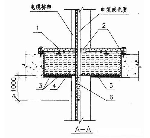 1-耐火隔板 2-防火堵料(防火泥) 3-支架 4-礦棉或玻璃纖維 5-耐火板或鋼板 6-防火涂料