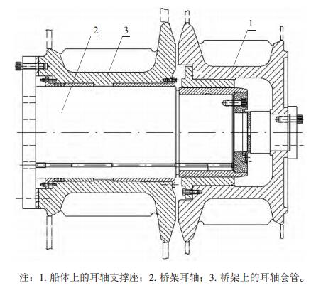 橋架耳軸是橋架與船體連接的關鍵部件,其一端承載橋架的重量等,另一端則坐落在船體的耳軸支撐座上。早期的小型絞吸挖泥船上的小型橋架,與船體采取相對簡單的鉸接形式。